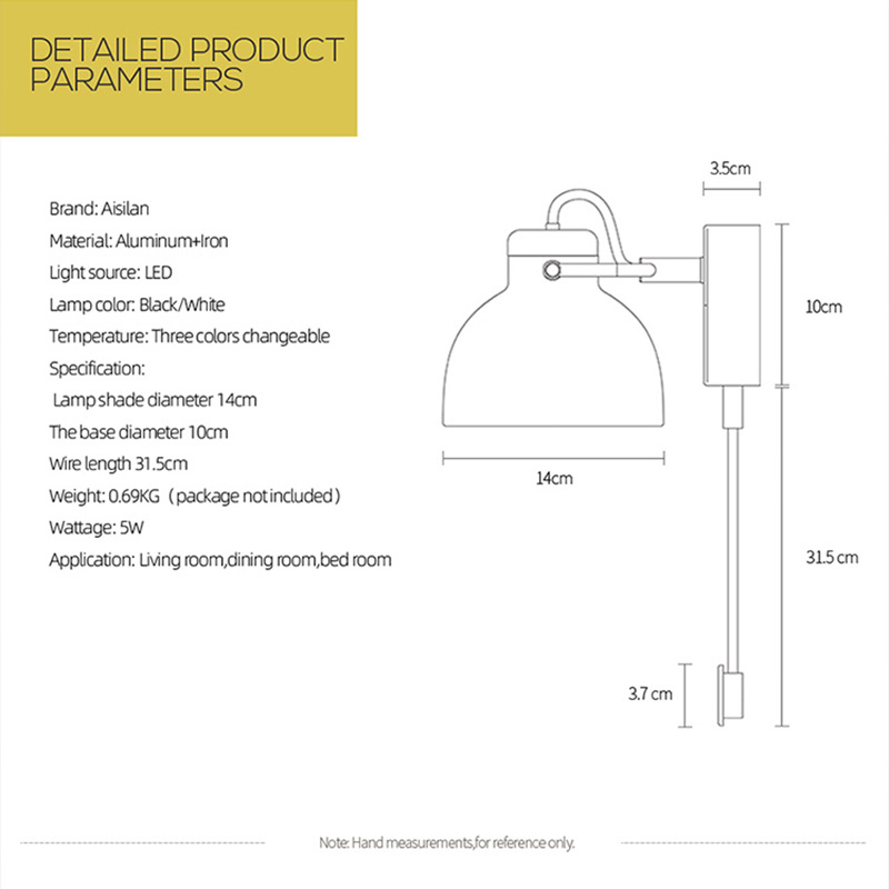 Marca: Aisilan Material: aluminio + Hierro Fuente de luz: LED Color de la lámpara: negro/blanco Temperatura: tres colores cambiables Especificación: diámetro de la pantalla de la lámpara 14 cm El diámetro de la base 10 cm Longitud del cable 31,5 cm Peso: 0,69 KG (paquete no incluido) Potencia: 5 W Aplicación: sala de estar, comedor, dormitorio Nota: medidas hechas a mano, solo como referencia.
